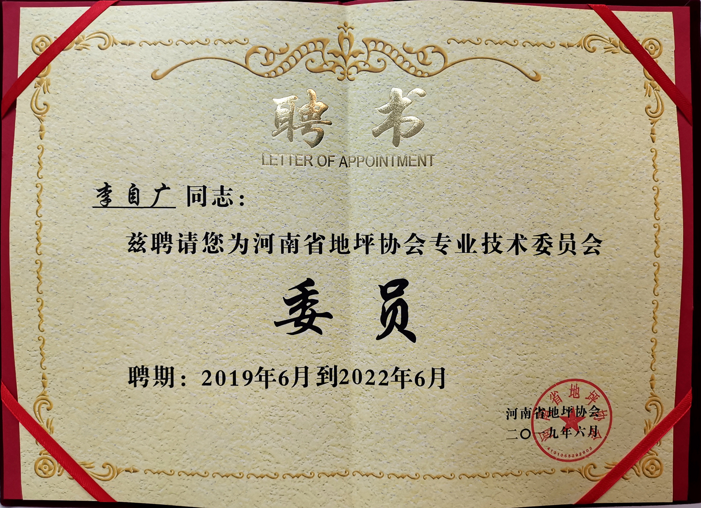 河南省地坪協(xié)會**技術(shù)委員會:“委員” 證書